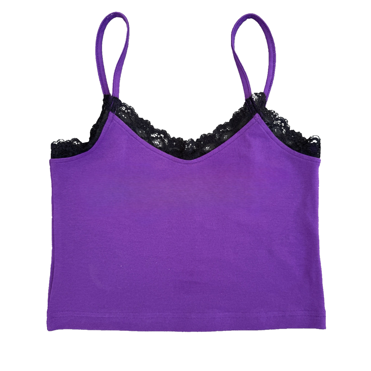 custom cut and sewn purple stretchy, fitted, low cut tank with lace lining the top and adjustable straps.